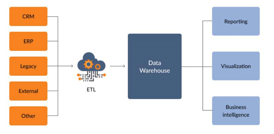 Data warehouses and ETL (Extract, Transform, and Load) are essential components of business intelligence. Data is extracted from one or more sources, transformed to match the needs of the data warehouse and then loaded into the data warehouse through the ETL process. Data warehouse is the central component of the BI system designed for data analysis and reporting. The combination of several technologies and elements facilitates the strategic use of data. Large amounts of data are electronically stored by a company and are intended for analysis and inquiry rather than transaction processing. It is a process of converting data into information and promptly making it accessible to users for better strategic decisions.