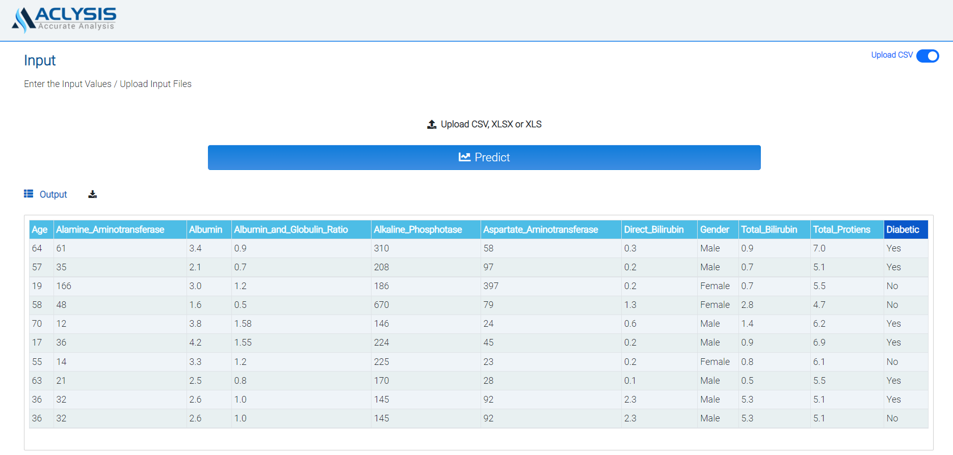 Deploying complex machine learning models is easy with Aclysis. Click "Deploy Model" to launch a web app for deployment. For instance, if you choose "Web App," you'll be prompted for feature inputs. As soon as values are given, the target variable's prediction is immediately displayed. Instead of providing a single set of numbers, you can upload a file and receive the corresponding forecasts in tabular form. Here's an illustration of a deployment page that includes a csv file: