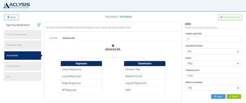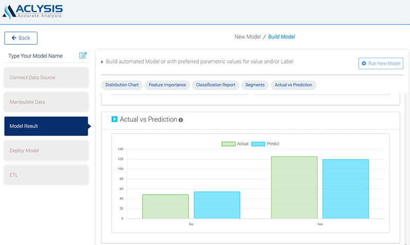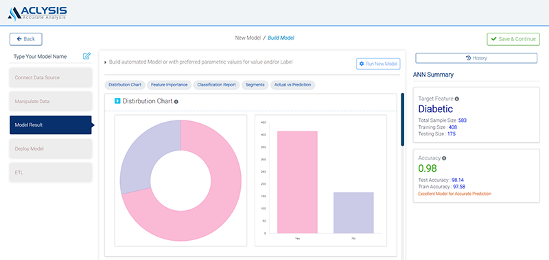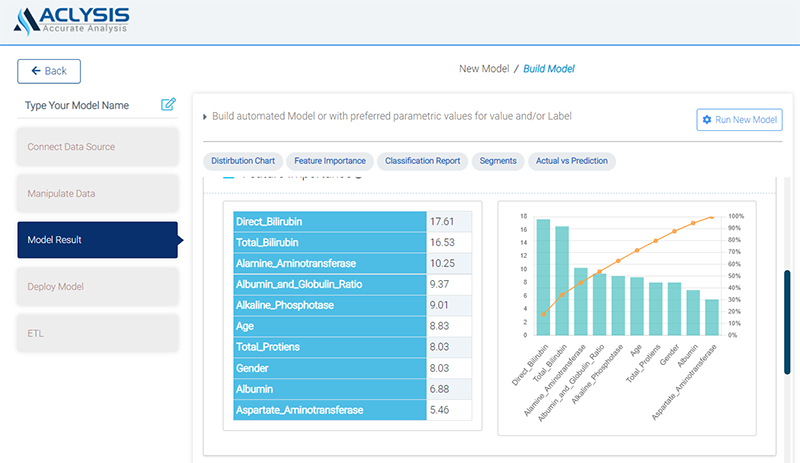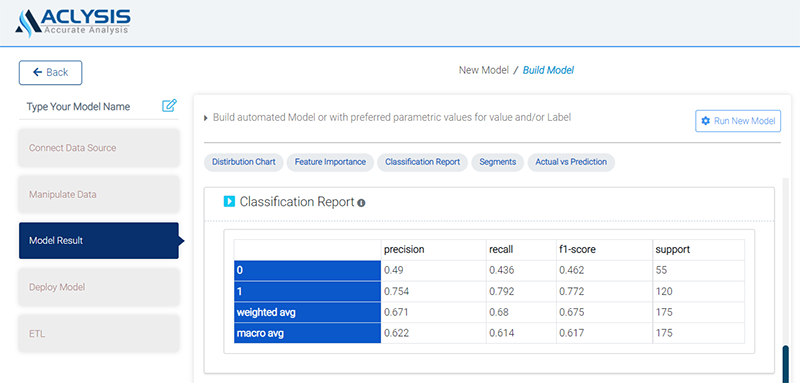 Click "Save & Continue" to move on to step 3, "Model Result," where a model is created and results are collected. In this stage, you must decide the features to include in the model as well as the target variable. You can choose from a wide range of models. You must choose the parameter values before running the advanced model. You will see the following display with model accuracy and numerous visualisations, including the target variable distribution and dispersion, feature importance, segmentations, and classification report, as soon as you submit the form. among other things, confusion matrix and an accurate vs. prediction plot.