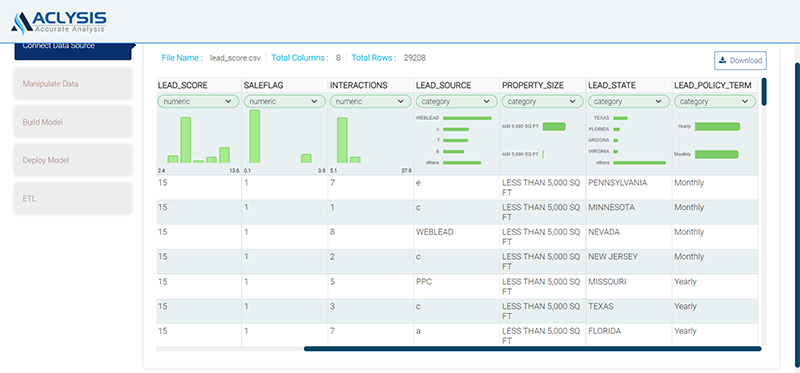 For demo purposes, this dataset has already been uploaded to Aclysis. But by just selecting "Connect Data Source," you can upload whatever dataset you desire.