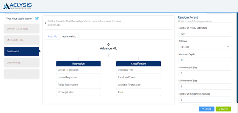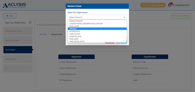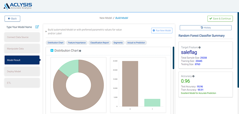 To continue to step 3, "Model Result," where a model is built and results are obtained, click "Save & Continue." You must pick the features you wish to use to build the model and the target variable in this phase. You will have a variety of model choices to consider. Before running the Advanced Model, you will be required to select the parameter values. As soon as you submit the form, the model will automatically build, and you will see the following display with model accuracy and various visuals, such as the target variable distribution and